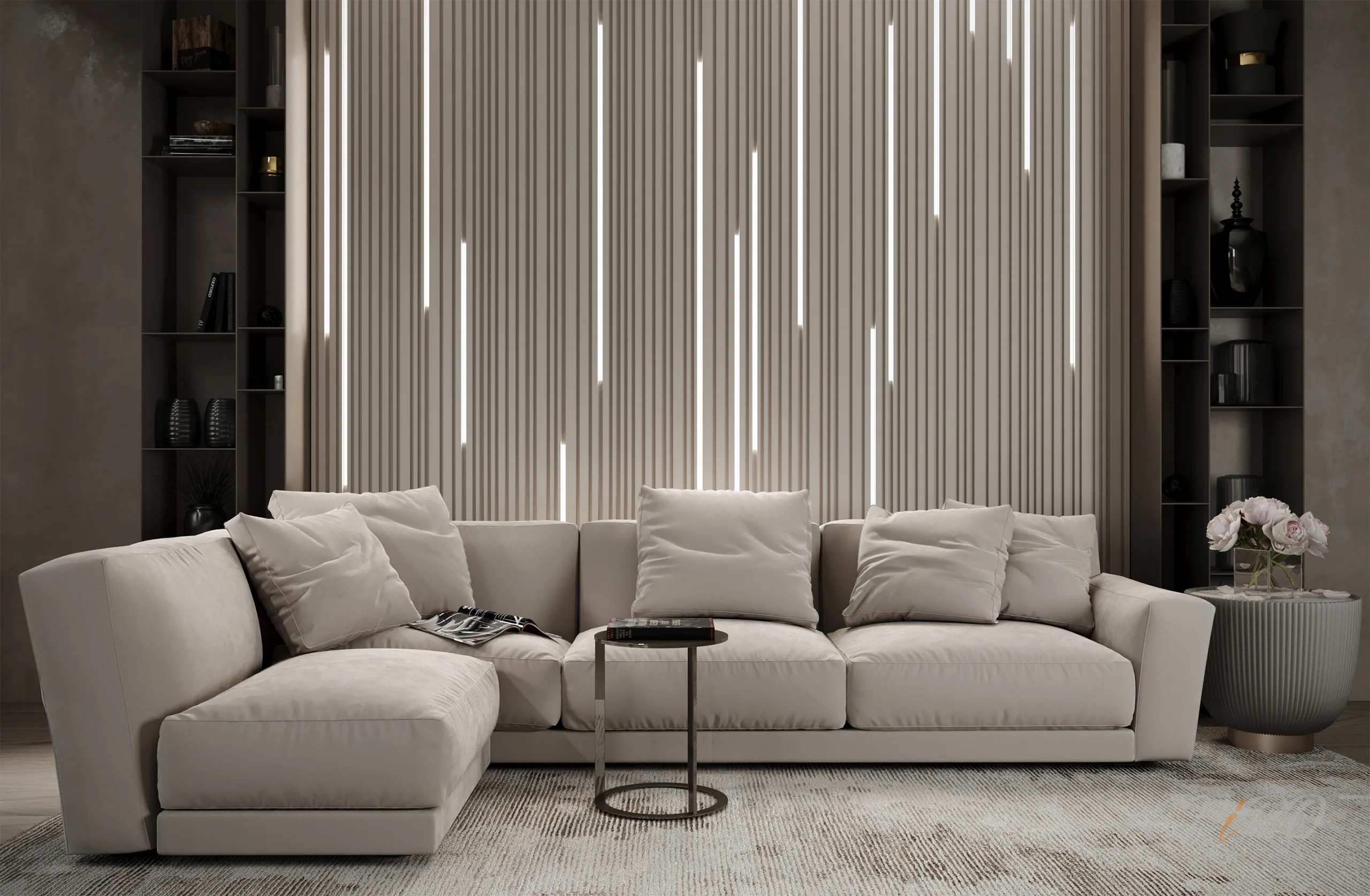 Система LED-подсветки, интегрированная в панели, открывает безграничные возможности для создания атмосферы. Она позволяет регулировать яркость и цвет света, что помогает подчеркнуть архитектурные линии и детали интерьера. Вечером, когда свет мягко преломляется через рельеф, пространство наполняется теплыми и уютными оттенками, создавая непревзойденное восприятие.